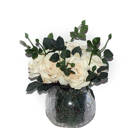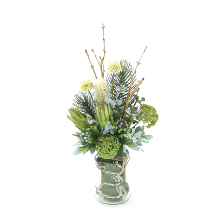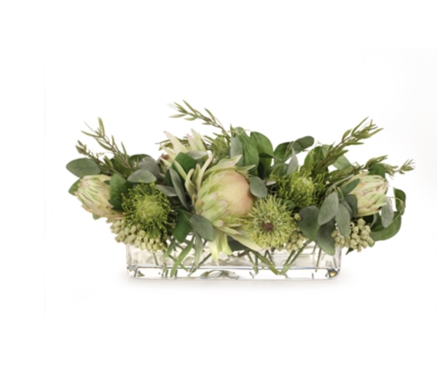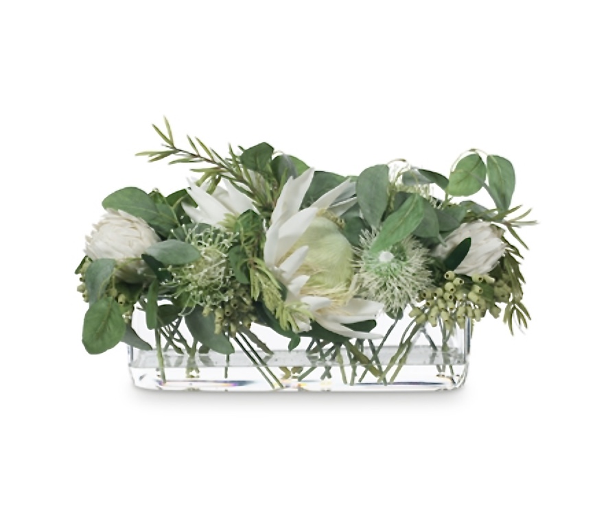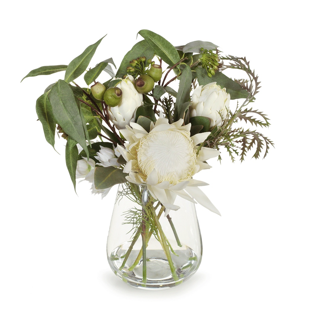 Native White Proteas in Glass Vase